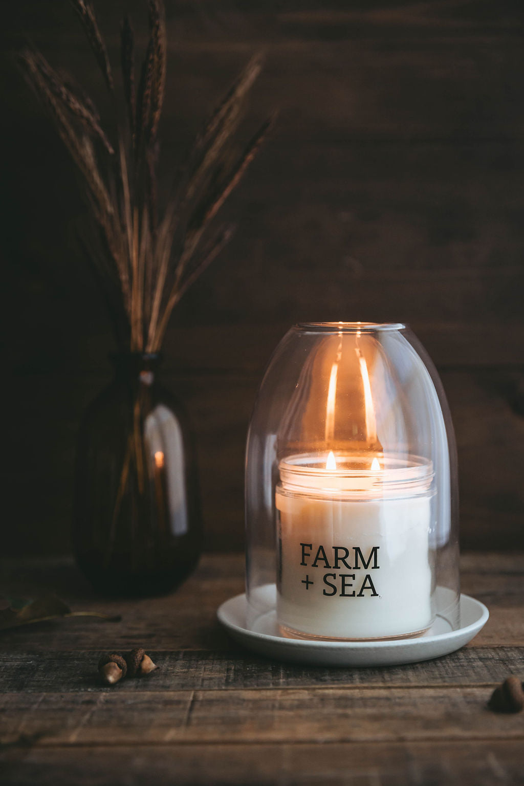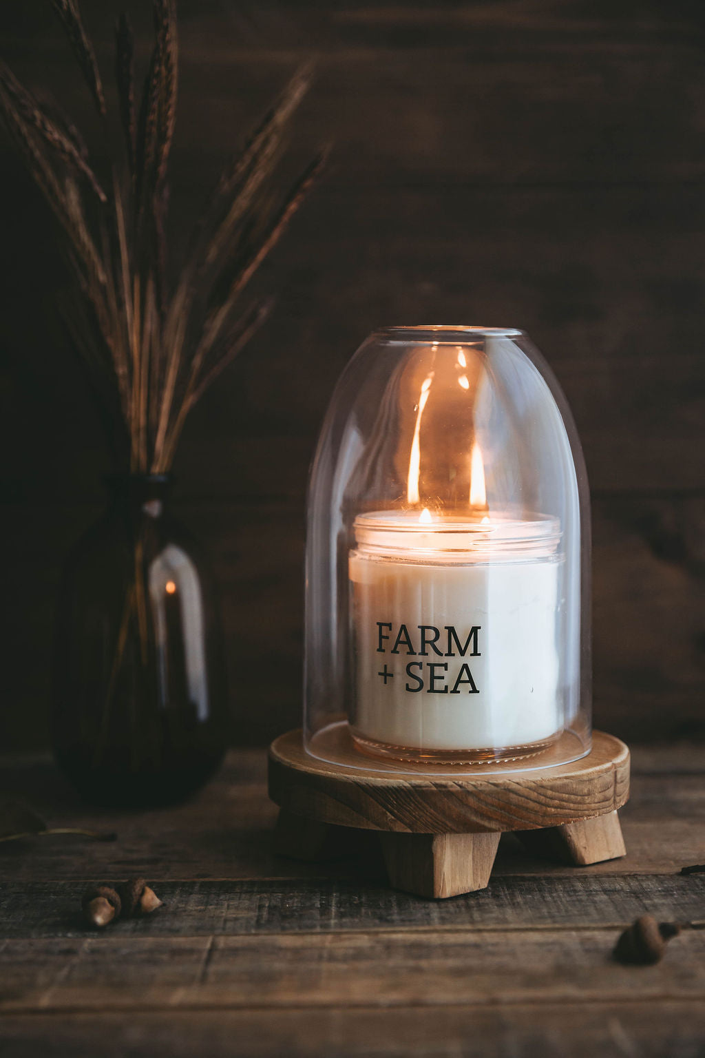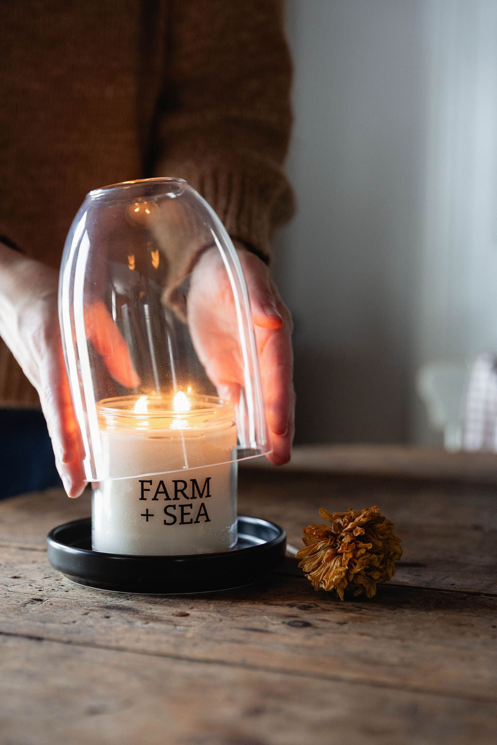 Our hand-blown hurricane bell sets are both beautiful and functional: the glass dome keeps your candle safe from drafts, while still allowing scent to drift out of the top opening. The raised lip of the bottom ceramic plate keeps the glass dome in place, and adds a pretty finishing touch to the set. Recommended for use with our large candle.